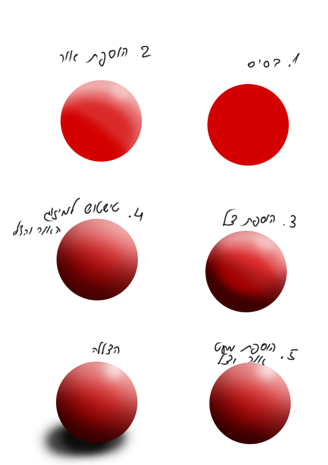 העיקרון הוא כזה: לפני שצובעים ציור, צריך להחליט מאיזה כיוון מגיע האור. אם זה שמש או מנורה או מהחלון או לא משנה מהיכן, רק שיהיה ברור לאורך כל צביעת הציור הכיוון של מקור האור. ולפי זה צובעים את העצמים: הצד שפונה לכיוון האור, הוא יהיה בהיר יותר, ז"א מואר יותר. הצד הנגדי, זה שקרני האור פחות מגיעים אליו - יהיה חשוך יותר - כהה יותר. ובכיוון הזה גם יהיה הצל על הרצפה או מה שזה לא יהיה. אם האור מגיע מצד ימין למעלה, והאובייקט הוא כדור, למשל, אז הצד הימני למעלה של הכדור יהיה מואר במיוחד, ובהדרגה ילך ויהיה כהה יותר, כאשר ככל שמתרבים לצד שמאל למטה - הצבע מתכהה יותר ויותר. באמצע הצבע יהיה הצבע הבסיסי של העצם. למשל אם החלטנו שהכדור אדום, אז בצד ימין למעלה הוא יהיה ורוד ואפילו ממש לבן, ובצד שמאל למטה הוא יהיה אדום כהה - בורדו. הצל של הכדור יהיה מתחתיו בצד שמאל.