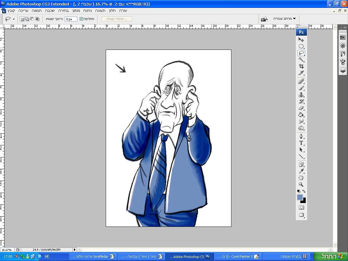 א. שימו לב האובייקט נמצא בשכבה נפרדת. אני לוקח את מקל הקסמים ובוחר את כל השטח הריק מחוץ לתמונה ואז אני עושה בחלון "בחירה" הפוך בחירה (כמובן שהאיור צריך להיות סגור ללא קווים פתוחים)