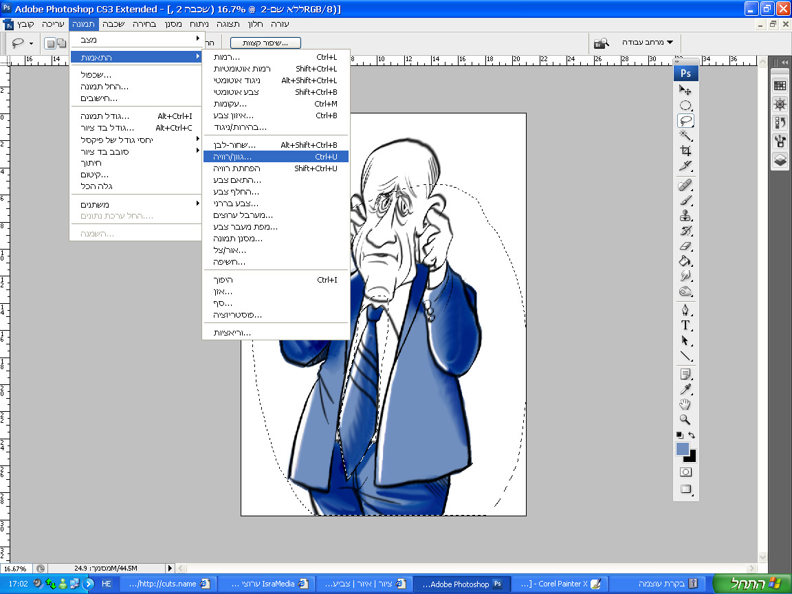 בוחר את השטח שאני רוצה לצבוע בצבע מסויים (למשל אצלנו שאני רוצה לצבוע בצבע שחור) ונכנס לפקודה "תמונה-התאמות- גוון רוויה