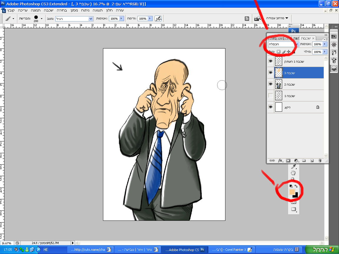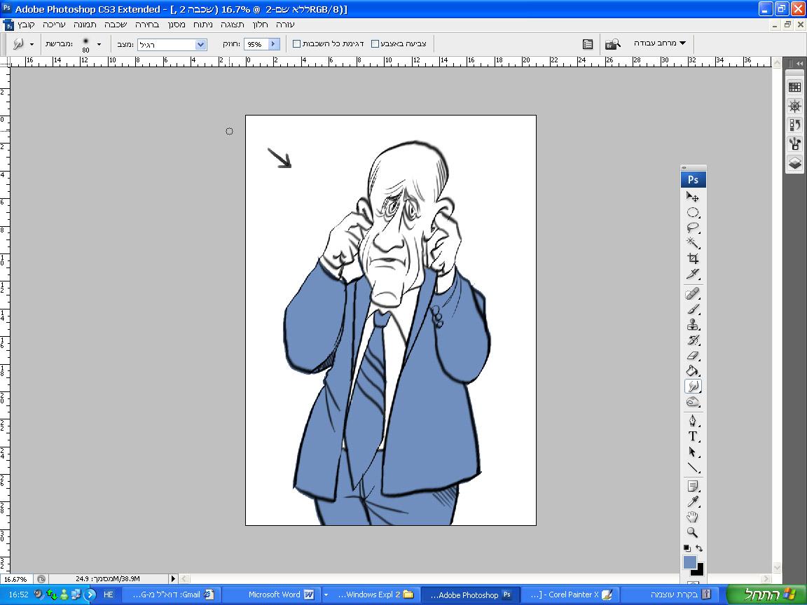 אני לוקח את כלי המריחה (מעל הכלי שעבדנו קודם. היד הקמוץ או לשמאלו תלוי איזה פוטושופ) ומתחיל למרוח לפי ההרגשה