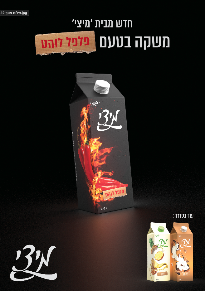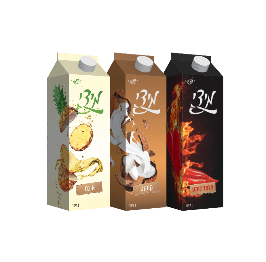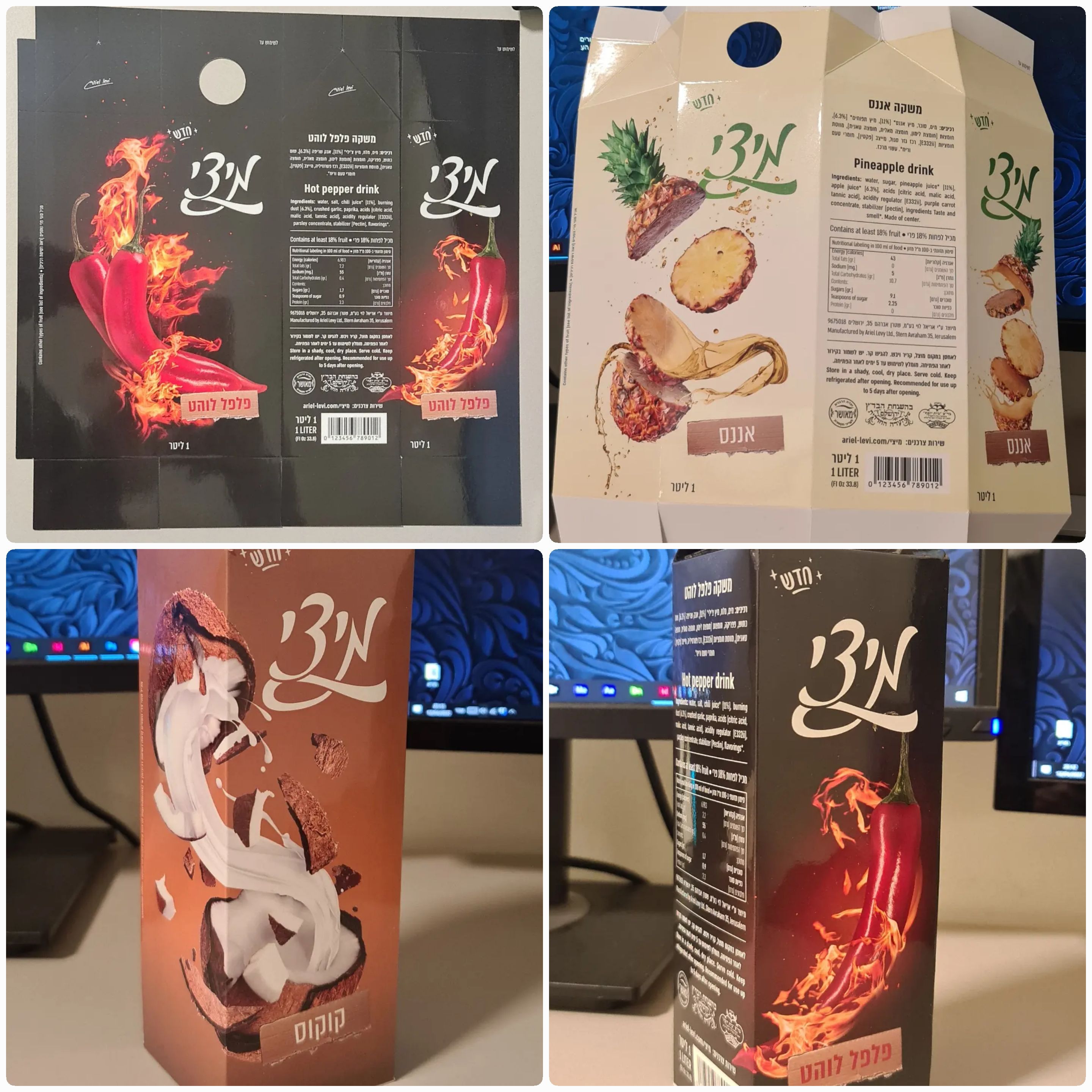 המצאתי חברת משקאות חדשה בשם מיצי (להלן) ועיצבתי לה 3 קרטוני שתיה.