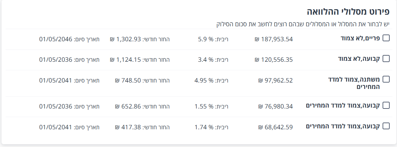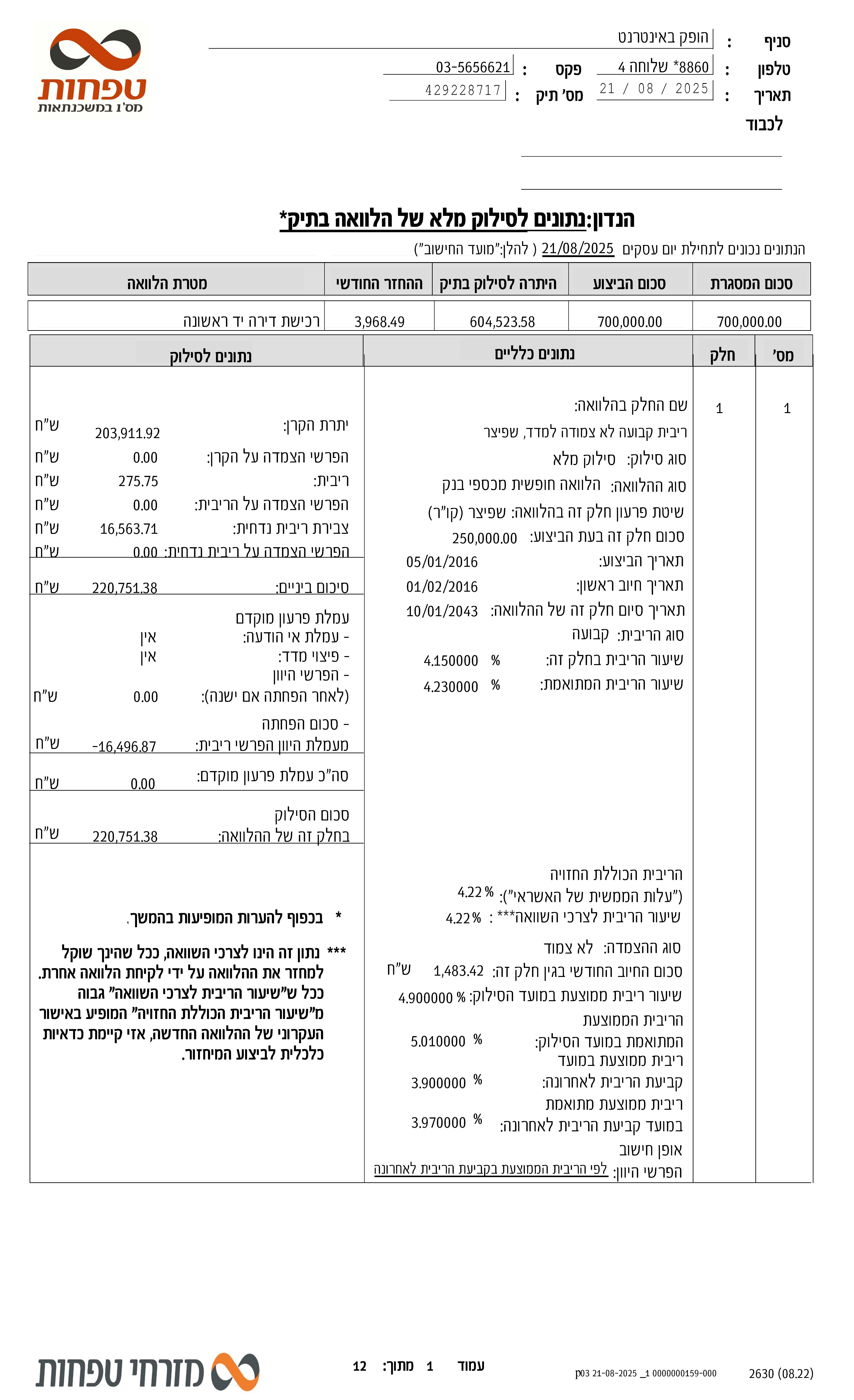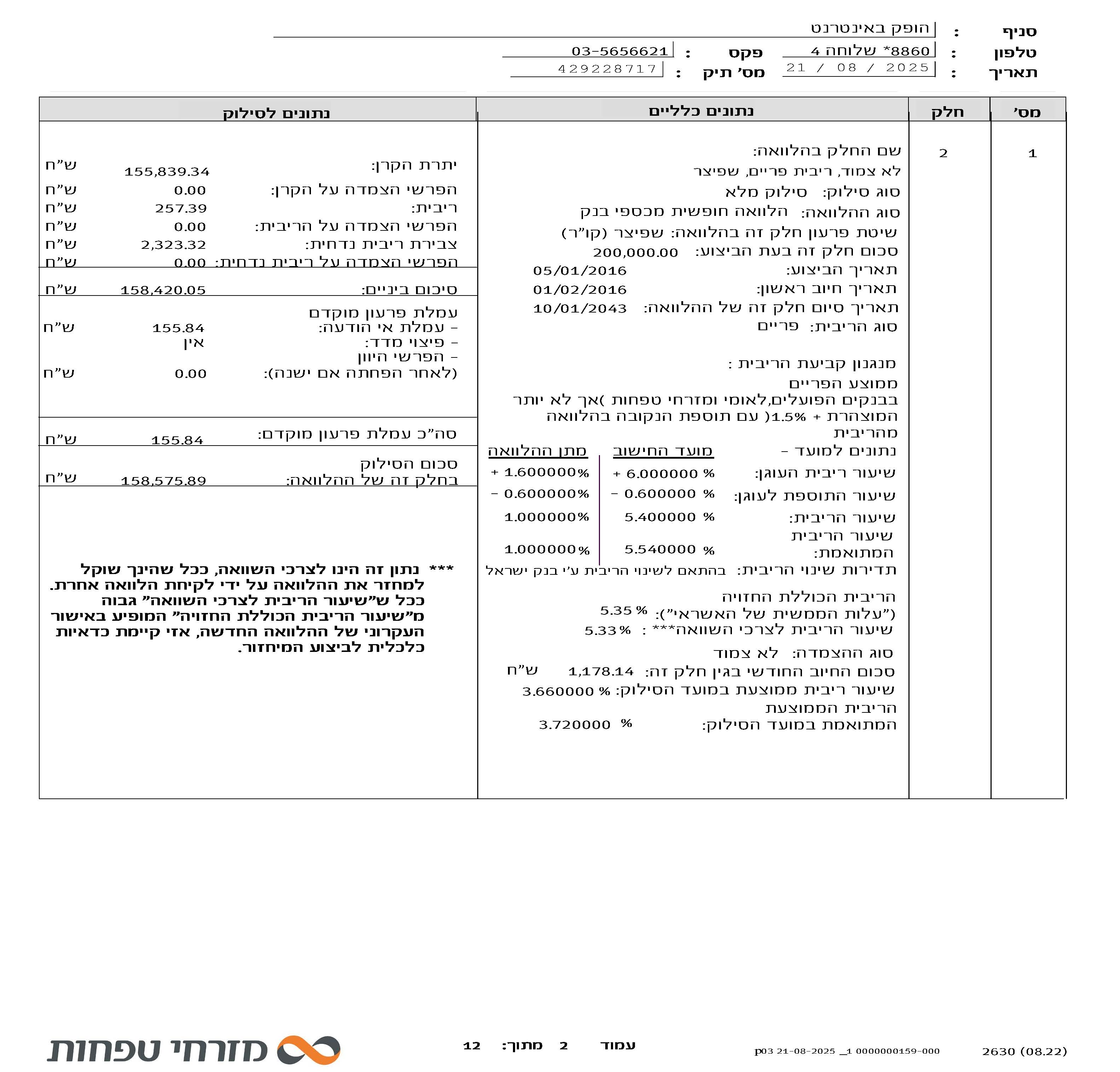 משתנה כל חמש שנים (על בסיס אג"ח ממשלתי), לא צמוד (החזר 1200 בחודש)212,000.00 ₪‪2.52%