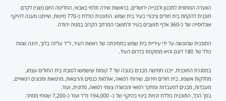 התכנית לבית חולים היא תכנית הרבה לפני עליזה בלוך, אבל צריך להביא מימון להקמת בית החולים וזה עוד לא נעשה (זה שיש שטח לא ממש עוזר)