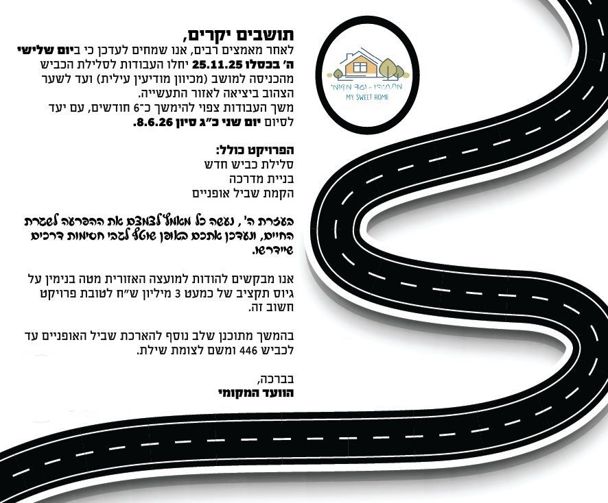 מפי מקורות בכירים בממשל המקומי נמסר: כי עבודות הפיתוח בכביש 446 מואצות בחודש הקרוב, בצורה שמבטיחה בס"ד את פתיחת הכביש בשני נתיבים לכל צד, עוד לפני פקקי חנוכה הנודעים לשמצה!!