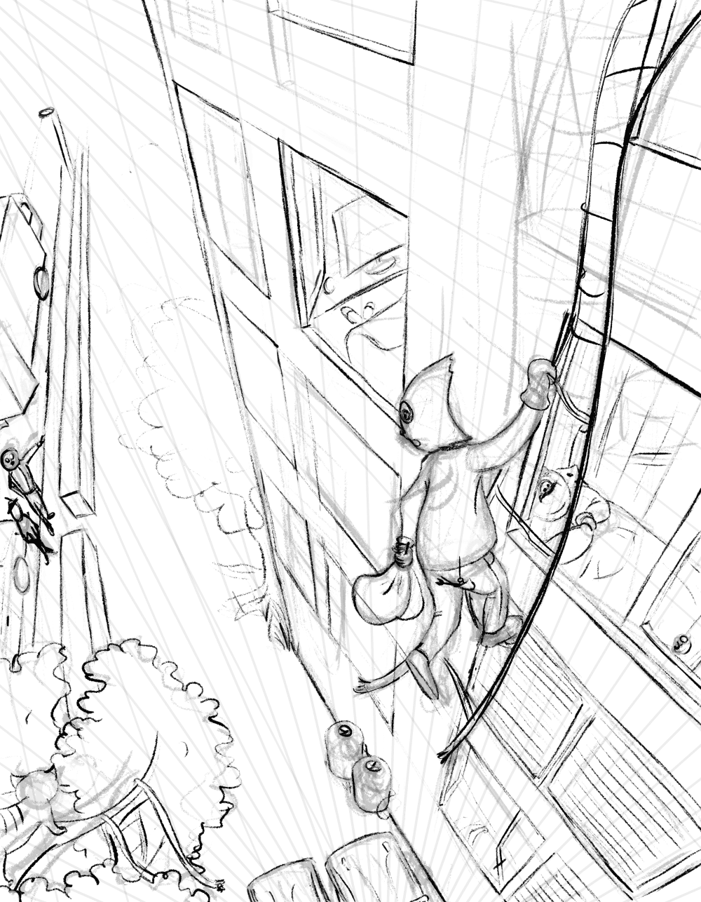 בנוסף גם לתת פחות או יותר צורות סופיות ומדויקות לכל האובייקטים בפריים שלנו. אפשר לעשות הרבה סקיצות בין הראשונה לשנייה, העיקר להגיע לתוצאה שאנחנו מרוצים ממנה.