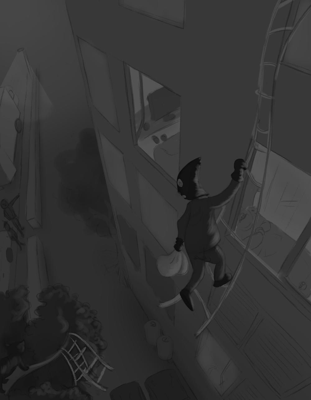 הסצנה שלנו מתרחשת בלילה, מה שאומר שכנראה שתאורת הסביבה שלנו היא כחולה. לכן כל הגוונים בציור אמורים לנטות קצת לכיוון הקר של הספקטרום. וכמובן, הגנב מקבל גוון ייחודי משלו כדי לעזור לצופה החביב להתמקד: )