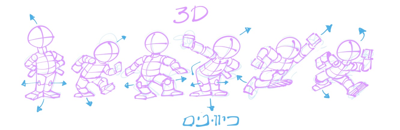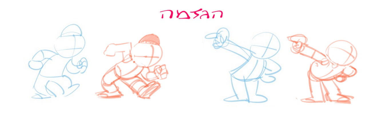 ובתור תרגיל אפילו חזק יותר כדאי לקחת את התנוחות שעשינו ולנסות להגזים אותם בעזרת קו-הפעולה, פשוט תעשו קו דינמי יותר/מוגזם יותר ותעשו את התנוחה בהתאם. התרגיל הזה יאפשר לכם לקלוע נכון יותר בפעמים הבאות שתציירו תנוחות.
