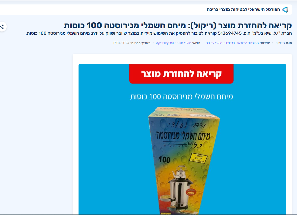 מיחם זהירות! ריקול על מיחם לא בטיחותי!