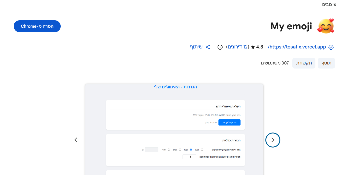 בעקבות הלהיט החדש של האימוג'ים החרדיים כאן בפרוג והביקוש העצום לכך, בס"ד פיתחתי (בעזרת AI כמובן...) תוסף כרום שמאפשר הדבקת אימוג'ים אישיים בכל מקום. התוסף לא מטמיע את האימוג'ים כמו אימוג'י אמיתי עם unicode, אלא הוא בסה"כ מצייר מחדש את התמונה שהעתקתם בגודל הרצוי ומדביקים אותה עם ctr+v.