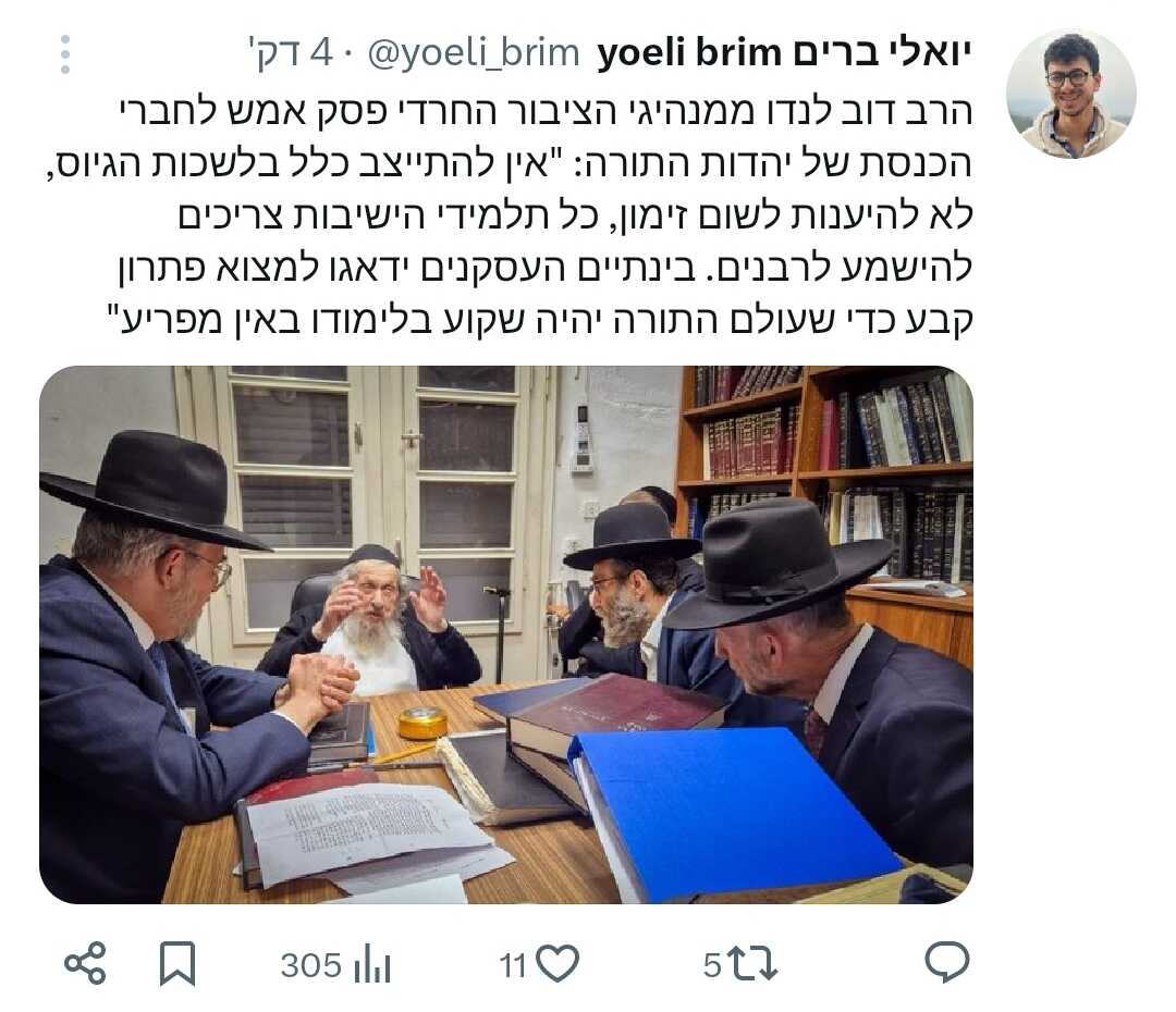 ‏עוד מישי כהן: כרגע האירוע בעיקר סביב גולדקנופף. בש״ס, דגל התורה וחלקים באגודת ישראל סבורים שצריך להמשיך בשיחות (בעיקר אחרי פיטורי גלנט) ולנסות בכל דרך למצוא פתרון לפני פירוק ממשלת ימין. וגם לגבי גולדקנופף, בכירים בלשכתו עושים הכל כדי לשכנע שיש הזדמנות לפתור את הסוגיה.