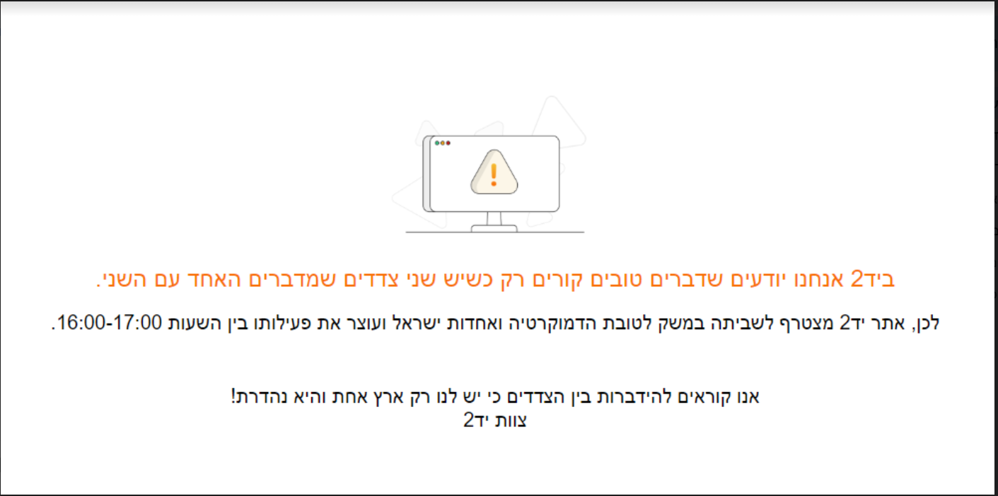 לכן, אתר יד2 מצטרף לשביתה במשק לטובת הדמוקרטיה ואחדות ישראל ועוצר את פעילותו בין השעות 16:00-17:00.