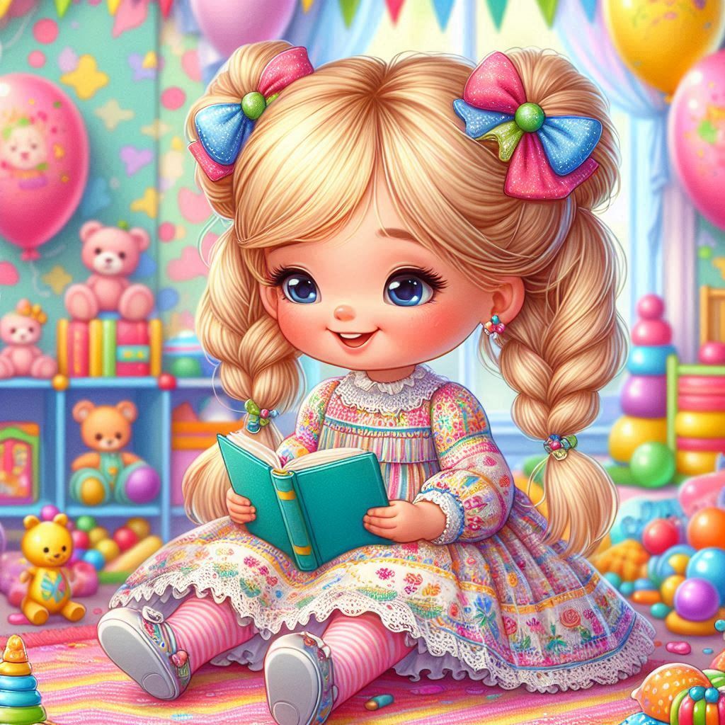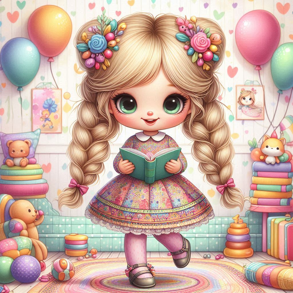 אשמח לתמונה של ילדה קוראת בספר קריאה עם רקע ילדותי של ספרים ואולי בלונים
