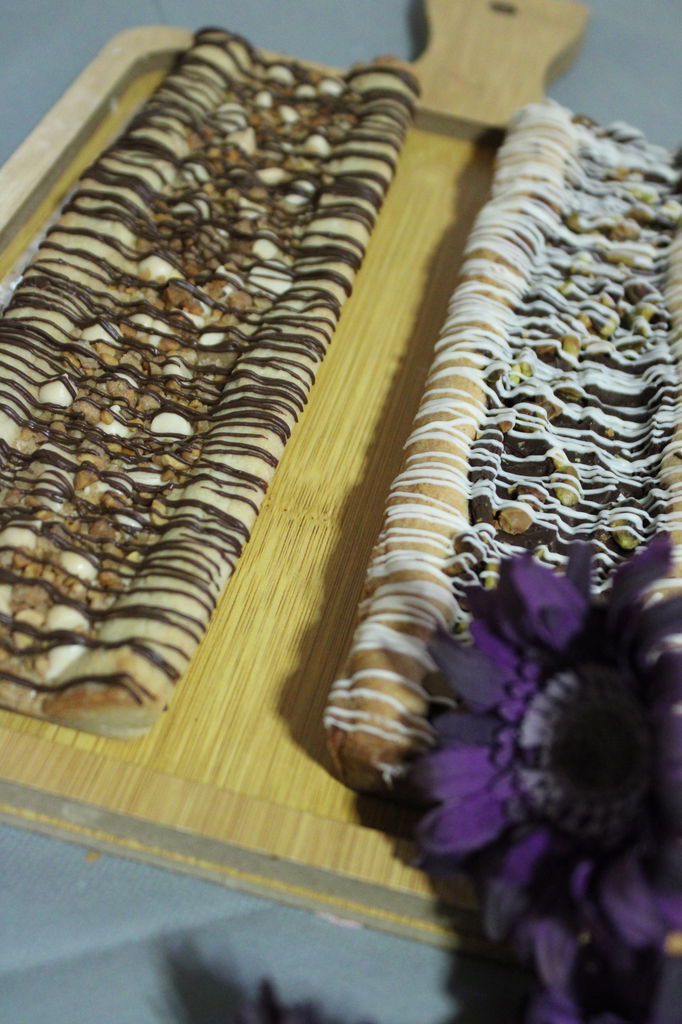 זילפתי שוקולד מומס מעל לעוגיה הגדולה. לבן על העוגיה עם הממרח שוקולד ומריר על ההיא עם קרם החלבה. ציננתי שהשוקולד יתקשה ובסכין חדה פרסתי בזהירות כדי לא לשבור את העוגיה הגדולה- לעוגיות אצבע.