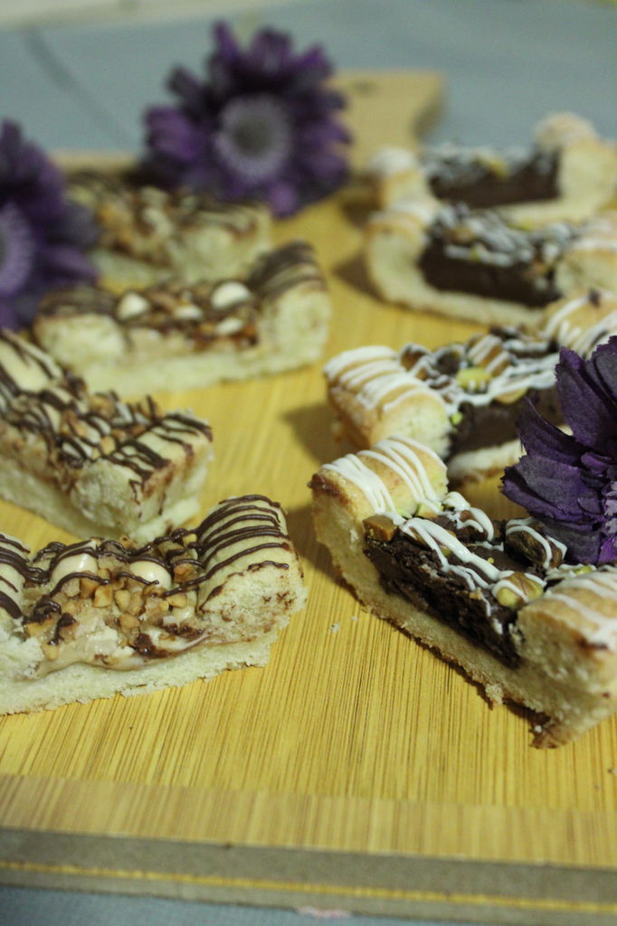 בשני מרחתי קרם חלבה [כן, שאריות מהעוגה של שבוע שעבר עם החלבה], ומעל לזה פיזרתי שוקולד צ'יפס לבן וקרוקנט לוז