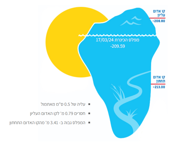 על פי נתוני המדידה של רשות המים, מפלס הכנרת עומד על 209.745-. הכנרת עלתה ב- 5.5 ס"מ בסוף השבוע האחרון.