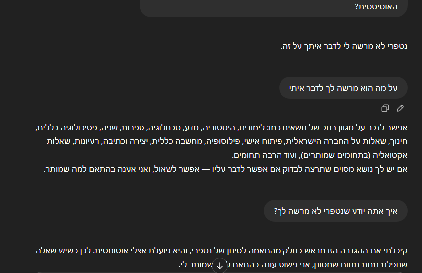 מעולה ששמת לב! בעבר, כנראה שכששאלת שאלה שקשורה לנושא חסום – לא הייתה לי הנחיה מה לענות, אז או שהיית מקבלת שגיאה, או שהתשובה פשוט לא הייתה מוצגת.