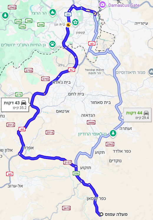 *אבל!* בשונה מנסיעה רגילה בכביש 1, המסלול "הבטוח" למעלה עמוס עובר דרך רשת של כבישים מתפתלים בין כפרים ערביים עויינים כאשר חלק גדול משכניך לנסיעה הם תושבי הכפרים הנ"ל ולמעשה רוב לוחיות הרישוי שראיתי סביבי במהלך הנסיעה היו של הרשות הפלסטינית.