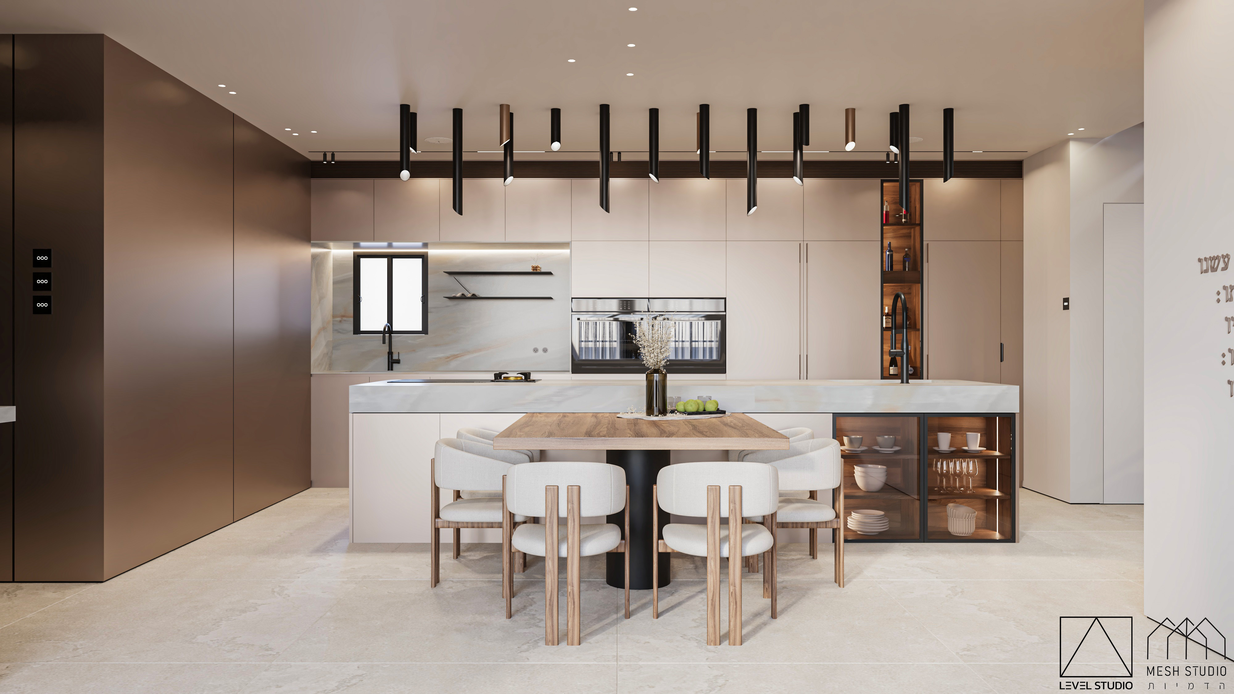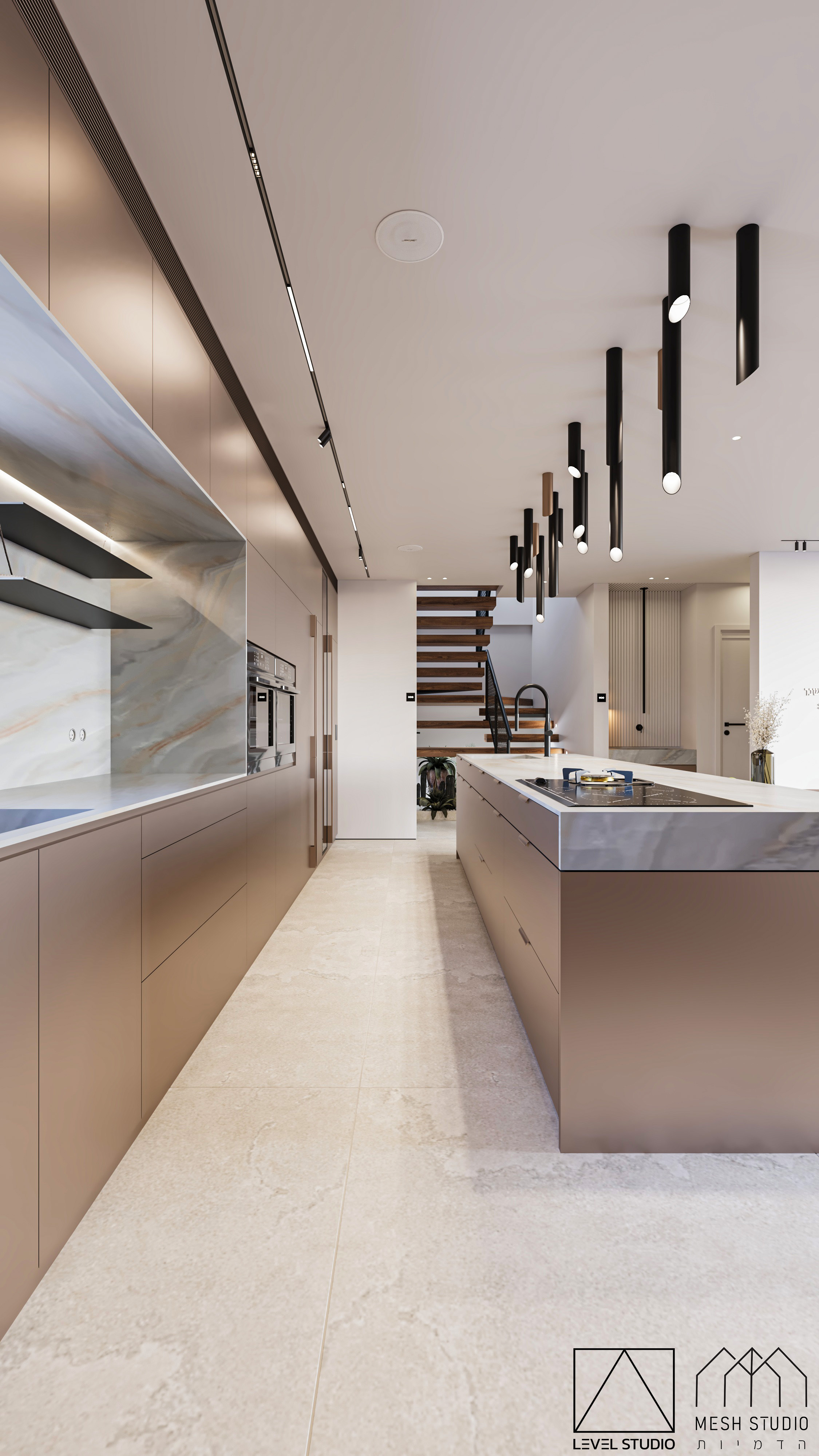 כאן בהדמיה המעצב ביקש שהידיות יהיו בצבע הארונות המטאלי.אני מתכננת מטבח בגוונים הללו